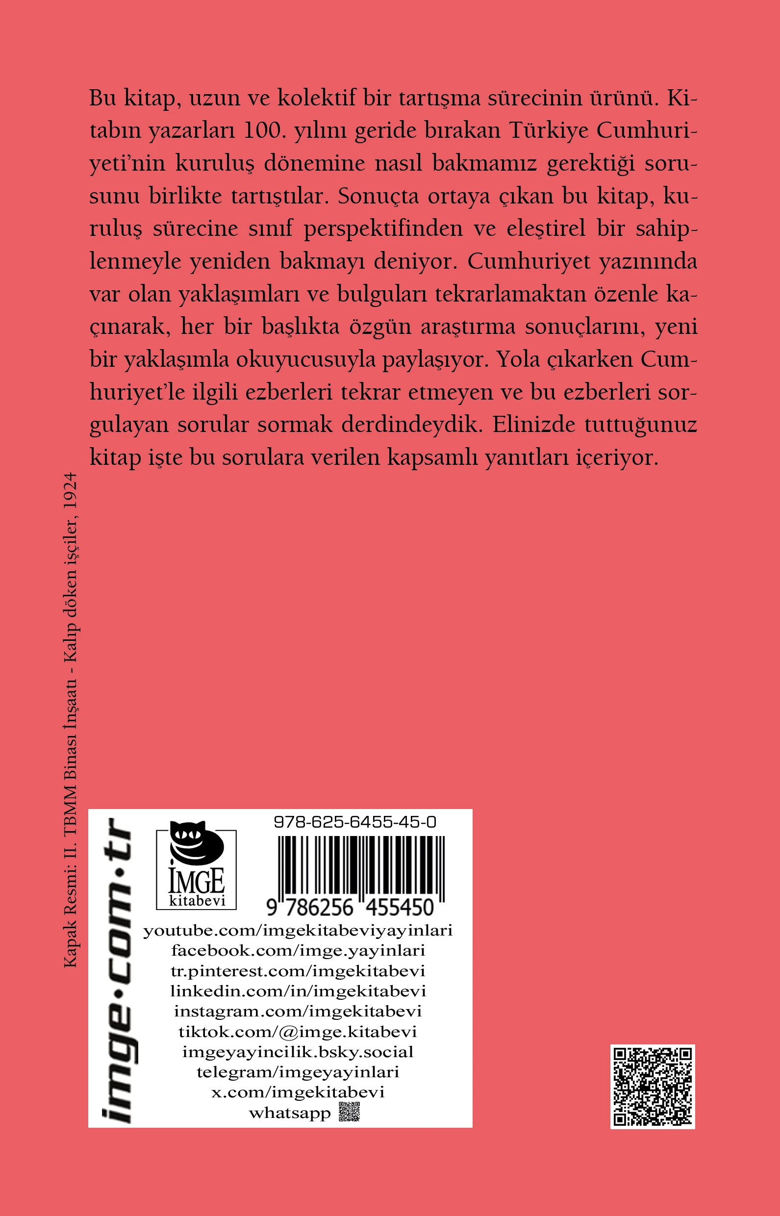 Bu kitap, uzun ve kolektif bir tartışma sürecinin ürünü. Kitabın yazarları 100. yılını geride bırakan Türkiye Cumhuriyeti’nin kuruluş dönemine nasıl bakmamız gerektiği sorusunu birlikte tartıştılar. Sonuçta ortaya çıkan bu kitap, kuruluş sürecine sınıf perspektifinden ve eleştirel bir sahiplenmeyle yeniden bakmayı deniyor. Cumhuriyet yazınında var olan yaklaşımları ve bulguları tekrarlamaktan özenle kaçınarak, her bir başlıkta özgün araştırma sonuçlarını, yeni bir yaklaşımla okuyucusuyla paylaşıyor. Yola çıkarken Cumhuriyet’le ilgili ezberleri tekrar etmeyen ve bu ezberleri sorgulayan sorular sormak derdindeydik. Elinizde tuttuğunuz kitap işte bu sorulara verilen kapsamlı yanıtları içeriyor.