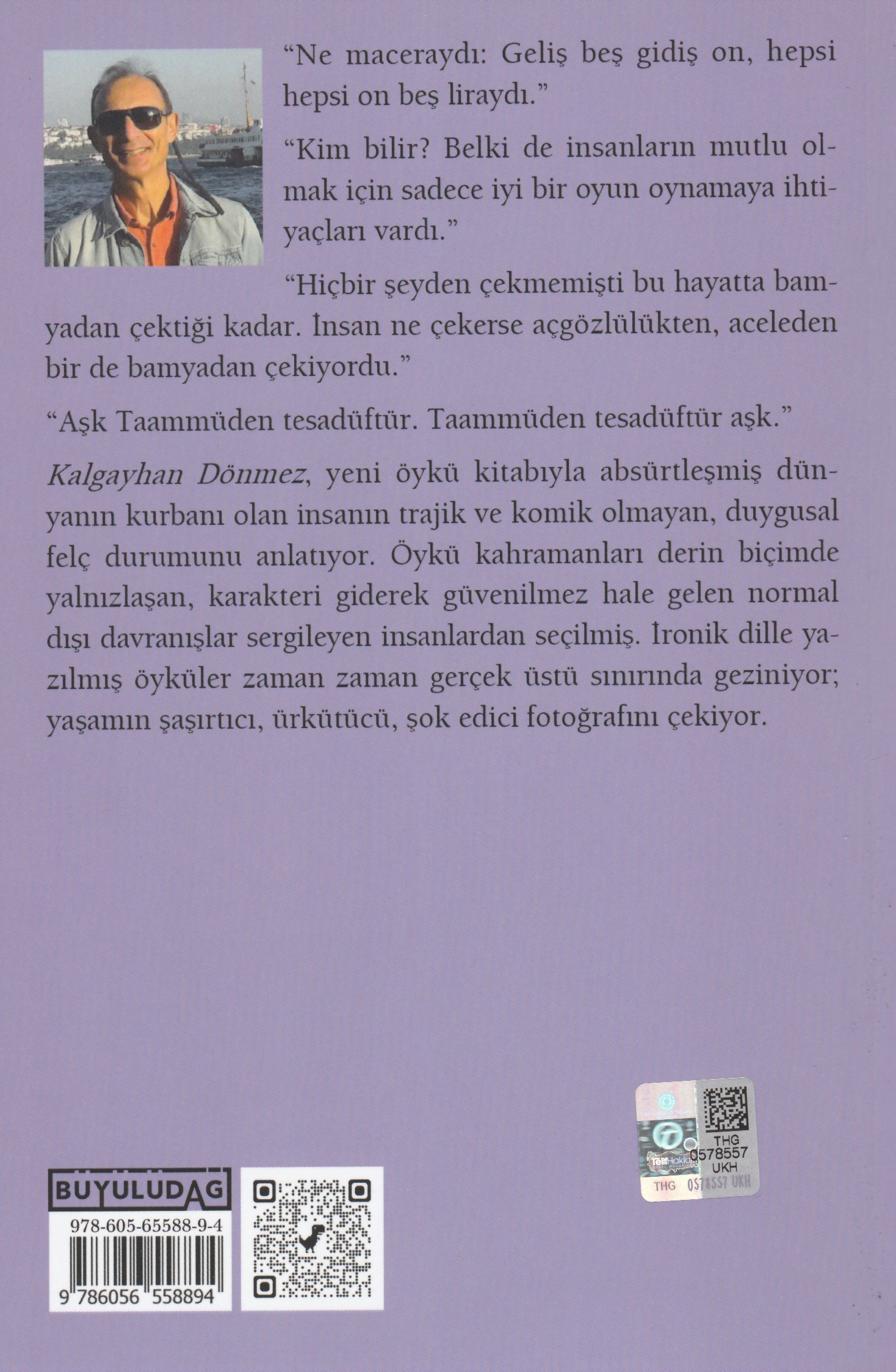 Özellikler: Boyut: 13 x 19,5 / İthal Kitap Kâğıdı / 99 sayfa / 2. Baskı, Ocak 2023 İlk baskı tarihi: Eylül 2022 “Ne maceraydı: Geliş beş gidiş on, hepsi hepsi on beş liraydı.” “Kim bilir? Belki de insanların mutlu olmak için sadece iyi bir oyun oynamaya ihtiyaçları vardı.” “Hiçbir şeyden çekmemişti bu hayatta bamyadan çektiği kadar. İnsan ne çekerse açgözlülükten, aceleden bir de bamyadan çekiyordu.” “Aşk Taammüden tesadüftür. Taammüden tesadüftür aşk.” Kalgayhan Dönmez, yeni öykü kitabıyla absürtleşmiş dünyanın kurbanı olan insanın trajik ve komik olmayan, duygusal felç durumunu anlatıyor. Öykü kahramanları derin biçimde yalnızlaşan, karakteri giderek güvenilmez hale gelen normal dışı davranışlar sergileyen insanlardan seçilmiş. İronik dille yazılmış öyküler zaman zaman gerçek üstü sınırında geziniyor; yaşamın şaşırtıcı, ürkütücü, şok edici fotoğrafını çekiyor.