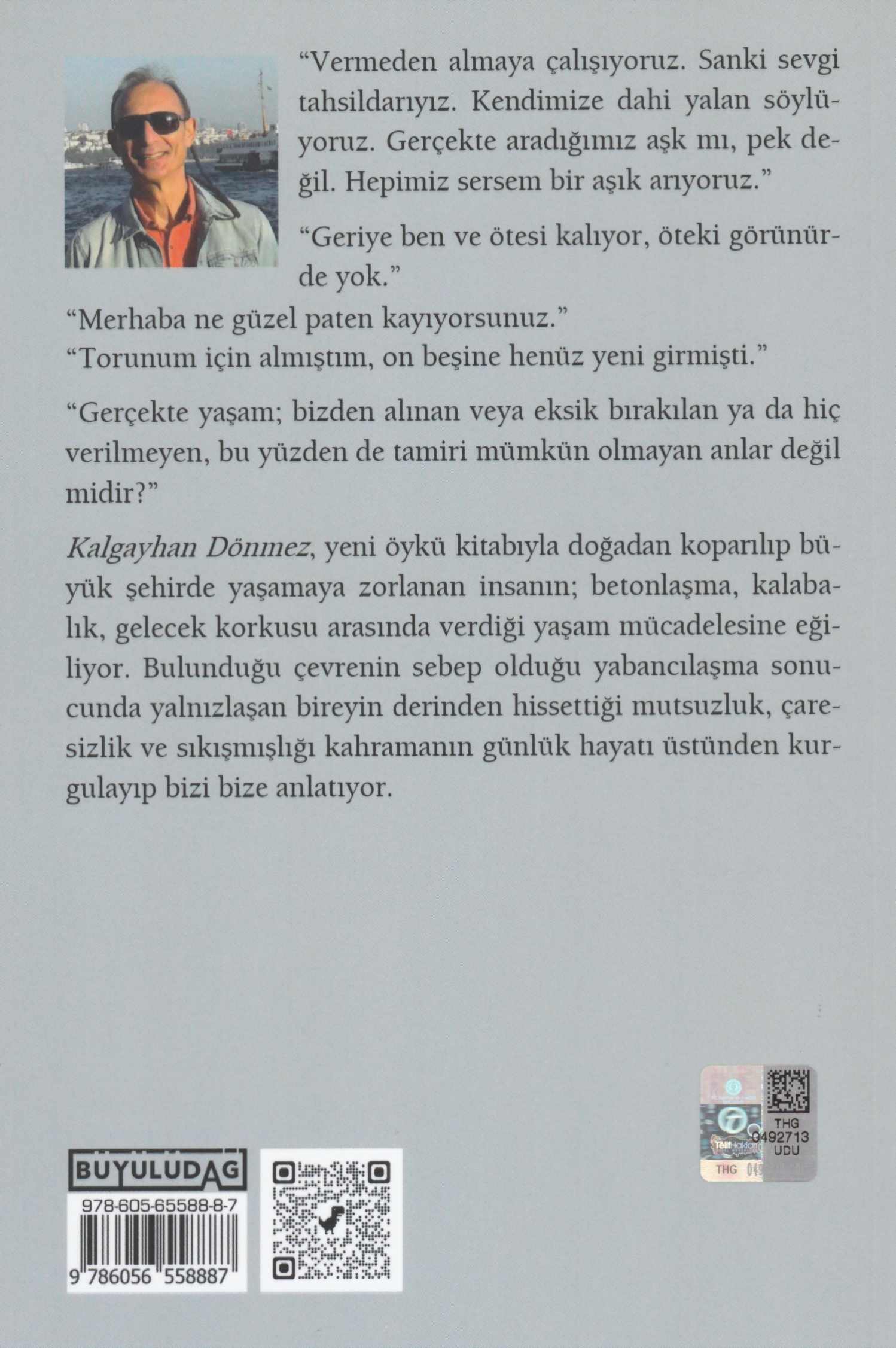 Kalgayhan Dönmez, yeni öykü kitabıyla doğadan koparılıp büyük şehirde yaşamaya zorlanan insanın; betonlaşma, kalabalık, gelecek korkusu arasında verdiği yaşam mücadelesine eğiliyor. Bulunduğu çevrenin sebep olduğu yabancılaşma sonucunda yalnızlaşan bireyin derinden hissettiği mutsuzluk, çaresizlik ve sıkışmışlığı kahramanın günlük hayatı üstünden kurgulayıp bizi bize anlatıyor.