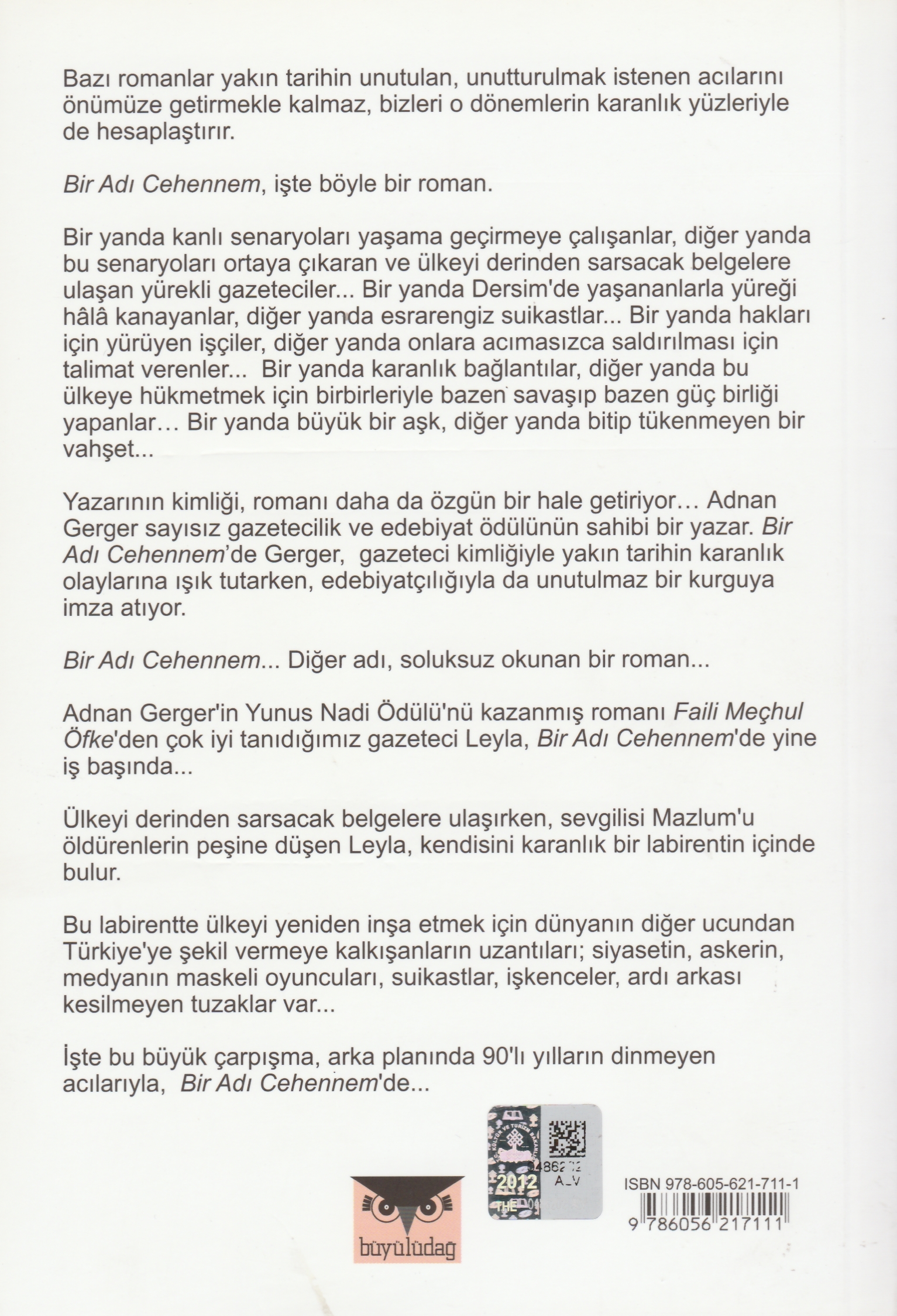 Yazarının kimliği, romanı daha da özgün bir hale getiriyor... Adnan Gerger sayısız gazetecilik ve edebiyat ödülünün sahibi bir yazar. Bir Adı Cehennemde Gerger, gazeteci kimliğiyle yakın tarihin karanlık olaylarına ışık tutarken, edebiyatçılığıyla da unutulmaz bir kurguya imza atıyor.