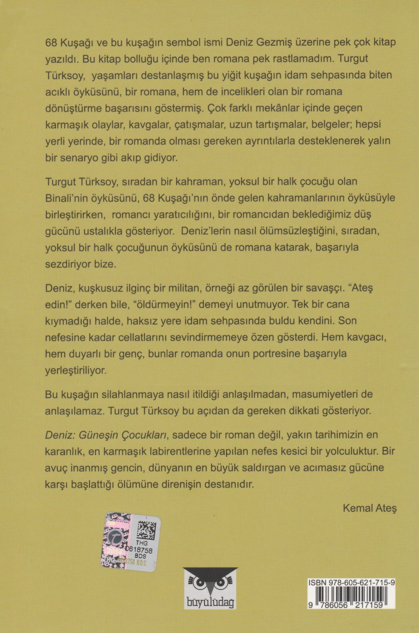 Turgut Tüksoy, sıradan bir kahraman, yoksul bir halk çocuğu olan Binali'nin öyküsünü, 68 Kuşağı'nın önde gelen kahramanlarının öyküsüyle birleştirirken, romancı yaratıcılığını, bir romancıdan beklediğimiz düş gücünü ustalıkla gösteriyor. Deniz'lerin nasıl ölümsüzleştiğini, sıradan, yoksul bir halk çocuğunun öyküsünü de romana katarak, başarıyla sezdiriyor bize.