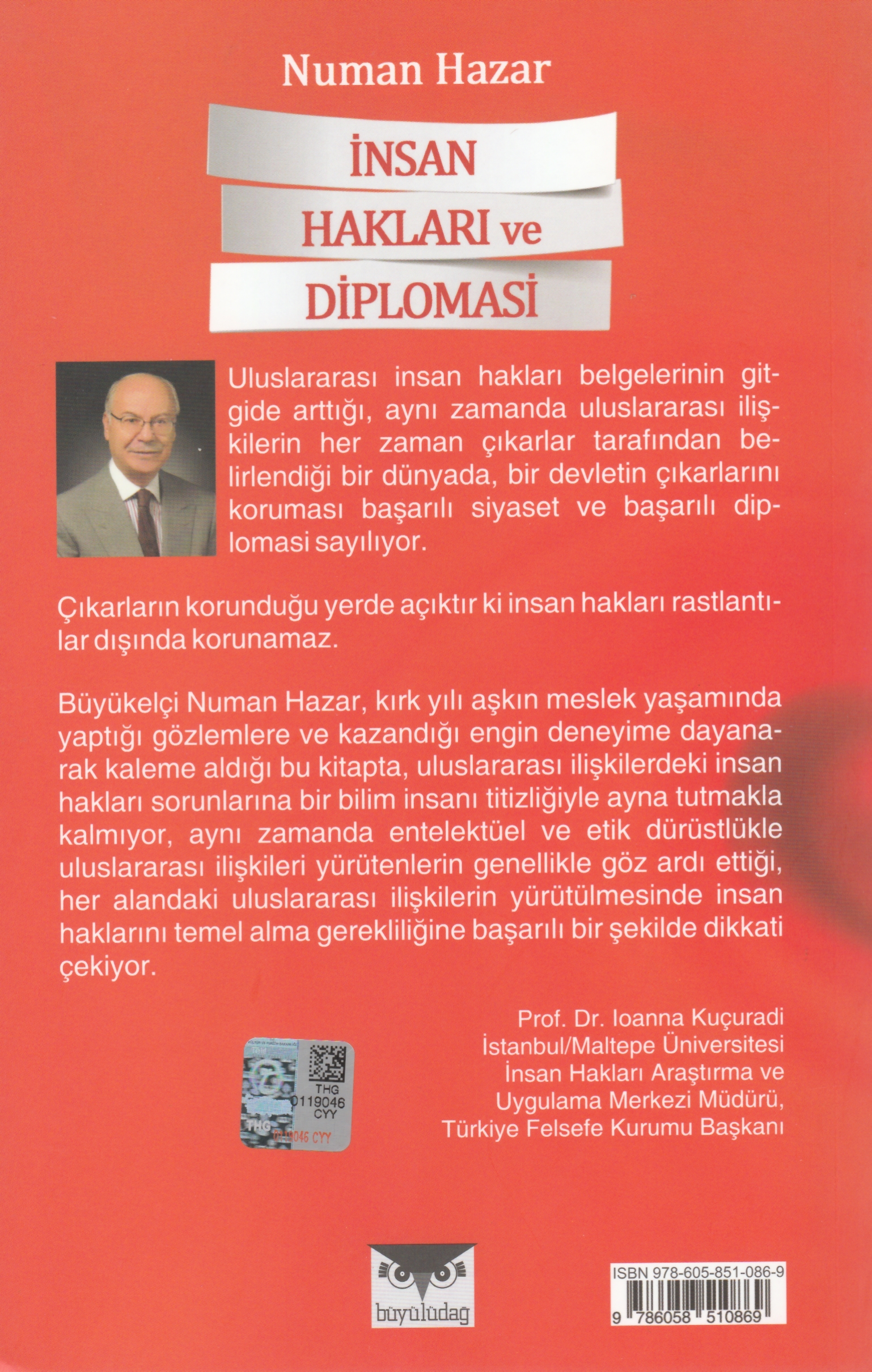 Özellikler: Boyut: 13,5 x 21 / İthal Kitap Kâğıdı / 295 sayfa / 1. Baskı / Şubat 2015 Uluslararası insan hakları belgelerinin gitgide arttığı, aynı zamanda uluslararası ilişkilerin her zaman çıkarlar tarafından belirlendiği bir dünyada, bir devletin çıkarlarını koruması başarılı diplomasi sayılıyor. Çıkarların korunduğu yerde açıktır ki insan hakları rastlantılar dışında korunamaz. Büyükelçi Numan Hazar, kırk yılı aşkın meslek yaşamında yaptığı gözlemlere ve kazandığı engin deneyime dayanarak kaleme aldığı bu kitapta, uluslararası ilişkilerdeki insan hakları sorunlarına bir bilim insanı titizliğiyle ayna tutmakla kalmıyor, aynı zamanda entelektüel ve etik dürüstlükle uluslararası ilişkileri yürütenlerin genellikle göz ardı ettiği, her alandaki uluslararası ilişkilerin yürütülmesinde insan haklarını temel alma gerekliliğine başarılı bir şekilde dikkati çekiyor. Prof. Dr. Ioanna Kuçuradi İstanbul/Maltepe Üniversitesi İnsan Hakları Araştırma ve Uygulama Merkezi Müdürü, Türkiye Felsefe Kurumu Başkanı