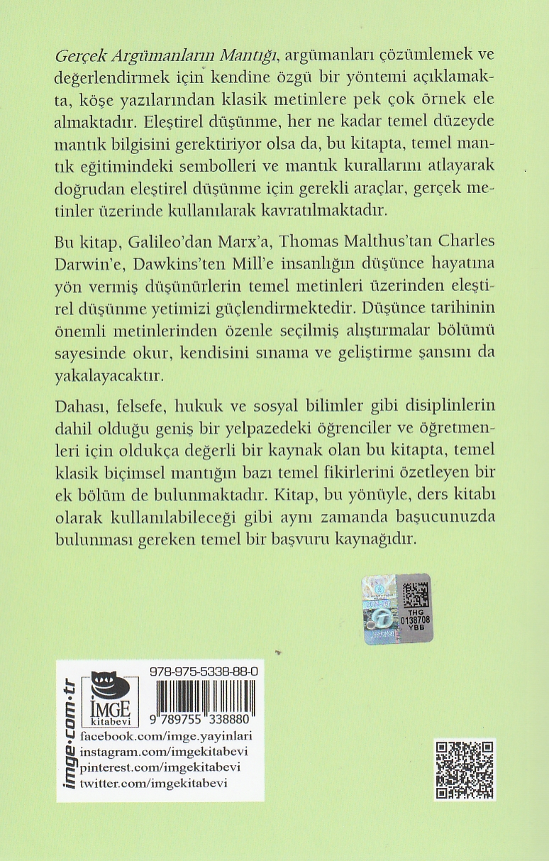 Özellikler: Boyut: 13,5 x 21 / İthal Kitap Kâğıdı / 396 sayfa / 2. Baskı, Ekim 2024 İlk baskı tarihi: Ocak 2018 Çevirmenler: Cenk Özdağ - Oğuz Akçelik Gerçek Argümanların Mantığı, argümanları çözümlemek ve değerlendirmek için