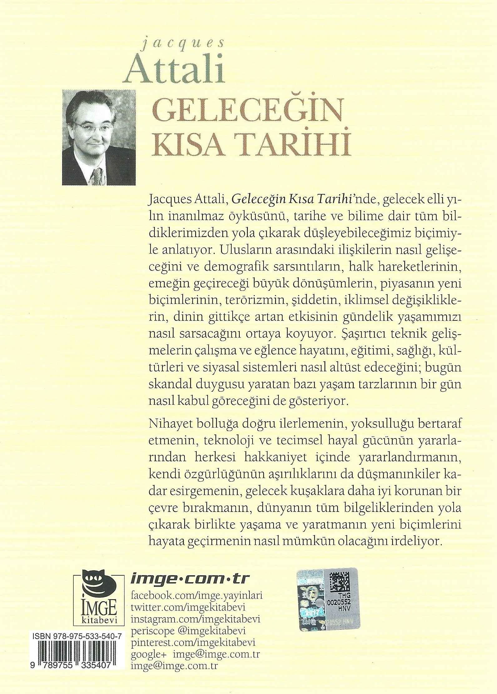 Özellikler: Boyut: 13,5 x 19,5 / İthal Kitap Kâğıdı / 329 sayfa / 3. Baskı, Ocak 2018 İlk baskı tarihi: Ağustos 2007 Çevirmen: Turhan Ilgaz Jacques Attali, Geleceğin Kısa Tarihi'nde, gelecek elli yılın inanılmaz öyküsünü,
