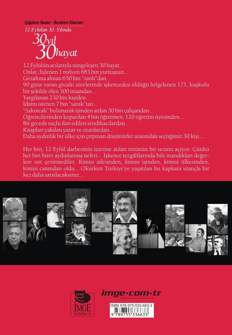 12 Eylül'ün acılarıyla simgeleşen 30 hayat... Onlar, fişlenen 1 milyon 683 bin yurttaştan... Gözaltına alınan 650 bin zanlıdan... 90 güne varan gözaltı sürelerinde işkenceden öldüğü belgelenen 171; kuşkulu bir şekilde ölen 300 insandan... Yargılanan 230 bin kişiden... İdamı istenen 7 bin sanıktan... Sakıncalı bulunarak işinden atılan 30 bin çalışandan... Öğrencilerinden koparılan 4 bin öğretmen, 120 öğretim üyesinden... Bir gecede suçlu ilan edilen sendikacılardan... Kitapları yakılan yazar ve ozanlardan... Daha aydınlık bir ülke için çırpınan düşünürler arasından seçtiğimiz 30 kişi.... Her biri, 12 Eylül darbesinin üzerine atılan örtünün bir ucunu açıyor. Çünkü her biri birer aydınlanma neferi... İşkence tezgâhlarında bile inandıkları değerlere sırt çevirmediler. Kimisi ailesinden, kimisi işinden, kimisi ülkesinden, kimisi canından oldu... Okurken Türkiye'ye yaşatılan bu kapkara utançla bir kez daha sarsılacaksınız...