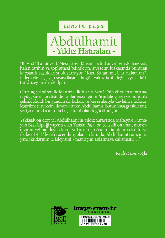 Yaklaşık on dört yıl Abdülhamit'in Yıldız Sarayı'nda Mabeyn-i Hümayun Başkâtipliği yapmış olan Tahsin Paşa, bu çelişkili ortamın, modernizmin vehme dayalı kanlı yıllarının en önemli tanıklarındandır ve ilk kez 1931'de tefrika edilmiş olan anılarında, Abdülhamit sarayının, yani iktidarının iç işleyişini - mantığını anlatmaya çalışmıştır... - Kudret Emiroğlu