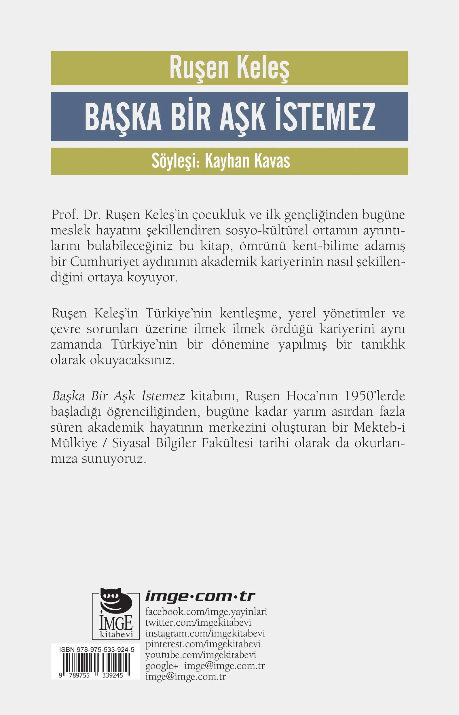 Başka Bir Aşk İstemez kitabını, Ruşen Hoca'nın 1950'lerde başladığı öğrenciliğinden, bugüne kadar yarım asırdan fazla süren akademik hayatının merkezini oluşturan bir Mekteb-i Mülkiye / Siyasal Bilgiler Fakültesi tarihi olarak da okurlarımıza sunuyoruz.