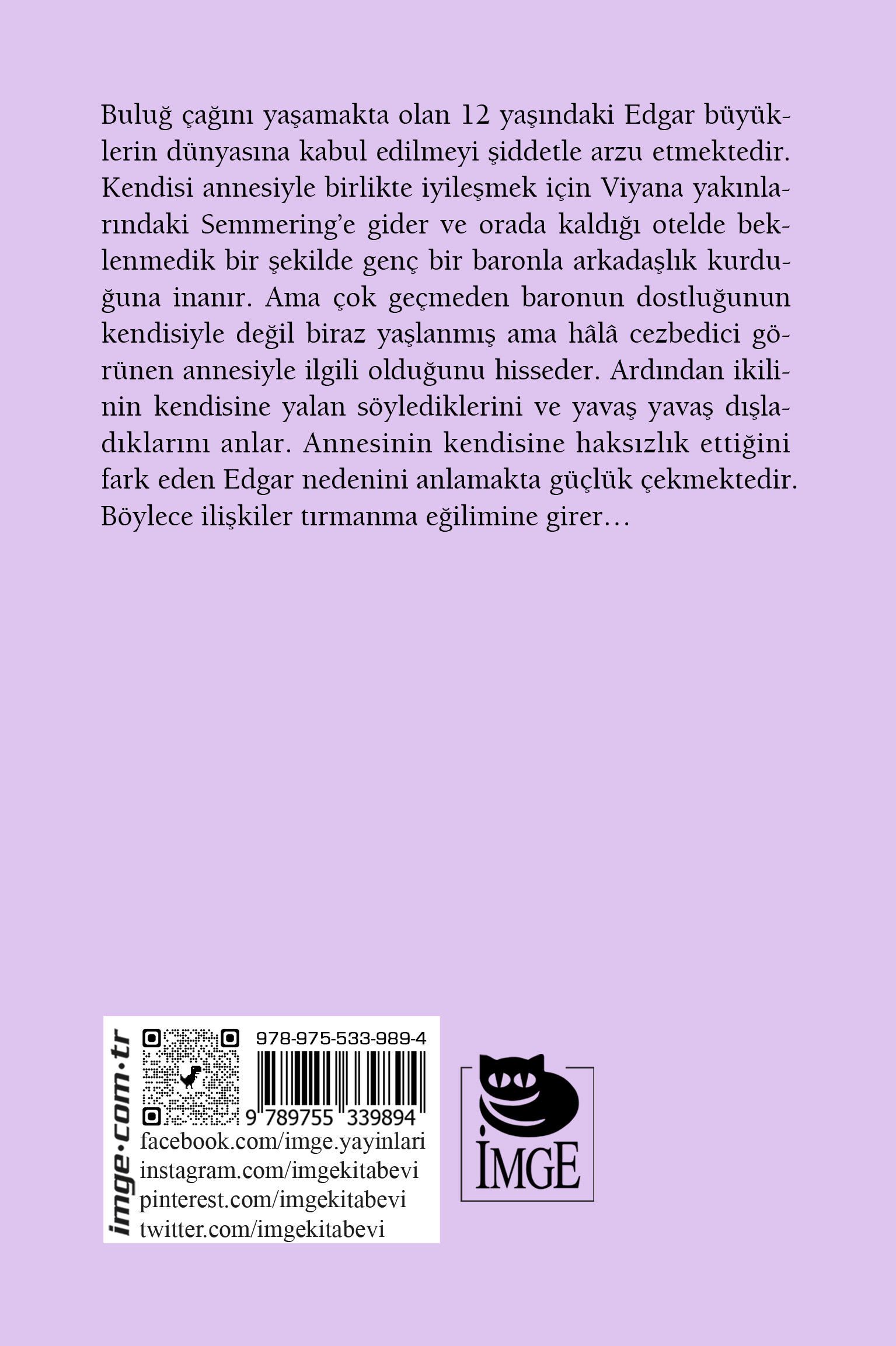 Özellikler: Boyut: 13,5 x 19,5 / İthal Kitap Kâğıdı / 107 sayfa / 1. Baskı, Şubat 2023 Çevirmen: Hüseyin Salihoğlu Buluğ çağını yaşamakta olan 12 yaşındaki Edgar büyüklerin dünyasına kabul edilmeyi şiddetle arzu etmektedir. Kendisi annesiyle birlikte iyileşmek için Viyana yakınlarındaki Semmering’e gider ve orada kaldığı otelde beklenmedik bir şekilde genç bir baronla arkadaşlık kurduğuna inanır. Ama çok geçmeden baronun dostluğunun kendisiyle değil biraz yaşlanmış ama hâlâ cezbedici görünen annesiyle ilgili olduğunu hisseder. Ardından ikilinin kendisine yalan söylediklerini ve yavaş yavaş dışladıklarını anlar. Annesinin kendisine haksızlık ettiğini fark eden Edgar nedenini anlamakta güçlük çekmektedir. Böylece ilişkiler tırmanma eğilimine girer…