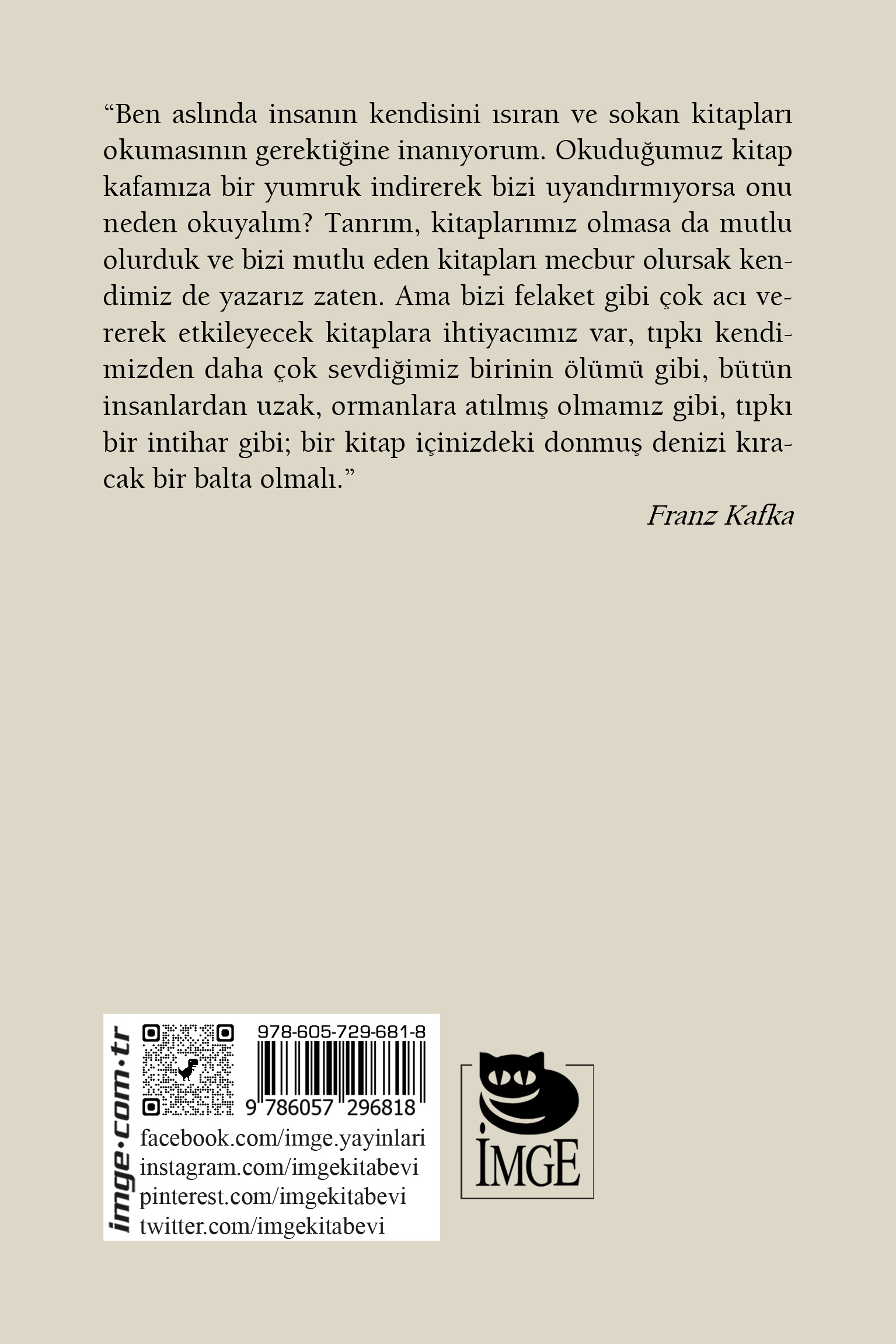 Özellikler: Boyut: 13,5 x 19,5 / İthal Kitap Kâğıdı / 92 sayfa / 1. Baskı, Şubat 2023 Çevirmen: Hüseyin Salihoğlu “Ben aslında insanın kendisini ısıran ve sokan kitapları okumasının gerektiğine inanıyorum. Okuduğumuz kitap kafamıza bir yumruk indirerek bizi uyandırmıyorsa onu neden okuyalım? Tanrım, kitaplarımız olmasa da mutlu olurduk ve bizi mutlu eden kitapları mecbur olursak kendimiz de yazarız zaten. Ama bizi felaket gibi çok acı vererek etkileyecek kitaplara ihtiyacımız var, tıpkı kendimizden daha çok sevdiğimiz birinin ölümü gibi, bütün insanlardan uzak, ormanlara atılmış olmamız gibi, tıpkı bir intihar gibi; bir kitap içinizdeki donmuş denizi kıracak bir balta olmalı.”