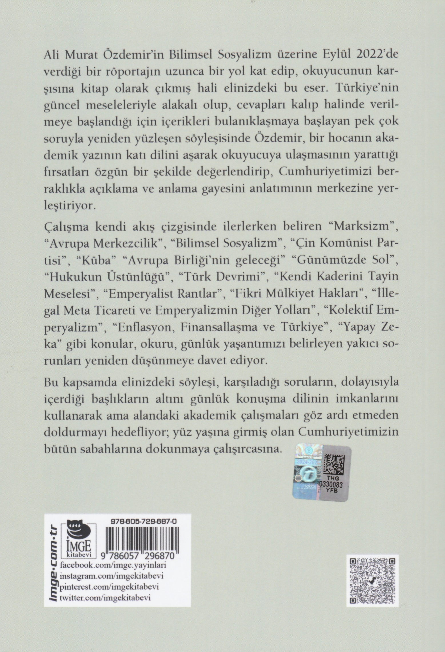 Özellikler: Boyut: 13,5 x 19,5 / İthal Kitap Kâğıdı / 117 sayfa / 3. Baskı, Ocak 2025 İlk baskı tarihi: Şubat 2023 Ali Murat Özdemir’in Bilimsel Sosyalizm üzerine Eylül 2022’de verdiği bir röportajın uzunca bir yol kat edip, okuyucunun karşısına kitap olarak çıkmış hali elinizdeki bu eser. Türkiye’nin güncel meseleleriyle alakalı olup, cevapları kalıp halinde verilmeye başlandığı için içerikleri bulanıklaşmaya başlayan pek çok soruyla yeniden yüzleşen söyleşisinde Özdemir, bir hocanın akademik yazının katı dilini aşarak okuyucuya ulaşmasının yarattığı fırsatları özgün bir şekilde değerlendirip, Cumhuriyetimizi berraklıkla açıklama ve anlama gayesini anlatımının merkezine yerleştiriyor. Çalışma kendi akış çizgisinde ilerlerken beliren “Marksizm”, “Avrupa Merkezcilik”, “Bilimsel Sosyalizm”, “Çin Komünist Partisi”, “Küba” “Avrupa Birliği’nin geleceği” “Günümüzde Sol”, “Hukukun Üstünlüğü”, “Türk Devrimi”, “Kendi Kaderini Tayin Meselesi”, “Emperyalist Rantlar”, “Fikri Mülkiyet Hakları”, “illegal Meta Ticareti ve Emperyalizmin Diğer Yolları”, “Kolektif Emperyalizm”, “Enflasyon, Finansallaşma ve Türkiye”, “Yapay Zeka” gibi konular, okuru, günlük yaşantımızı belirleyen yakıcı sorunları yeniden düşünmeye davet ediyor. Bu kapsamda elinizdeki söyleşi, karşıladığı soruların, dolayısıyla içerdiği başlıkların altını günlük konuşma dilinin imkanlarını kullanarak ama alandaki akademik çalışmaları göz ardı etmeden doldurmayı hedefliyor; yüz yaşına girmiş olan Cumhuriyetimizin bütün sabahlarına dokunmaya çalışırcasına.