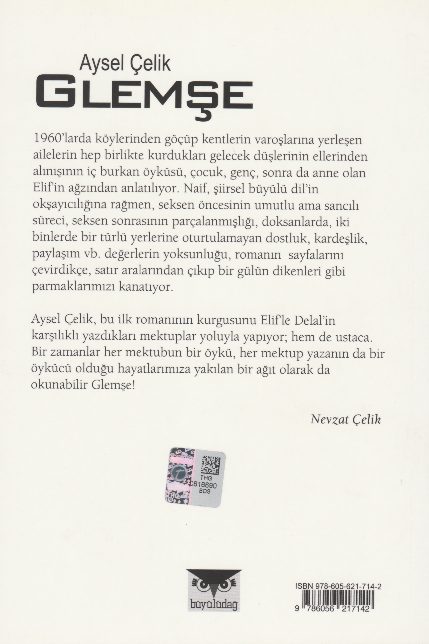 Aysel Çelik, bu ilk romanının kurgusunu Elifle Delalin karşılıklı yazdıkları mektuplar yoluyla yapıyor; hem de ustaca. Bir zamanlar her mektubun bir öykü, her mektup yazanın da bir öykücü olduğu hayatlarımıza yakılan bir ağıt olarak da okunabilir Glemşe!