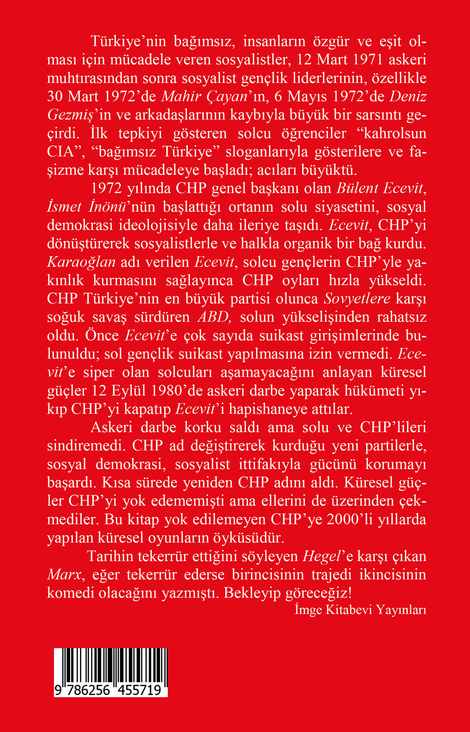 Türkiye’nin bağımsız, insanların özgür ve eşit olması için mücadele veren sosyalistler, 12 Mart 1971 askeri muhtırasından sonra sosyalist gençlik liderlerinin, özellikle 30 Mart 1972’de Mahir Çayan’ın, 6 Mayıs 1972’de Deniz Gezmiş’in ve arkadaşlarının kaybıyla büyük bir sarsıntı geçirdi. İlk tepkiyi gösteren solcu öğrenciler “kahrolsun CIA”, “bağımsız Türkiye” sloganlarıyla gösterilere ve faşizme karşı mücadeleye başladı; acıları büyüktü. 1972 yılında CHP genel başkanı olan Bülent Ecevit, İsmet İnönü’nün başlattığı ortanın solu siyasetini, sosyal demokrasi ideolojisiyle daha ileriye taşıdı. Ecevit, CHP’yi dönüştürerek sosyalistlerle ve halkla organik bir bağ kurdu. Karaoğlan adı verilen Ecevit, solcu gençlerin CHP’yle yakınlık kurmasını sağlayınca CHP oyları hızla yükseldi. CHP Türkiye’nin en büyük partisi olunca Sovyetlere karşı soğuk savaş sürdüren ABD, solun yükselişinden rahatsız oldu. Önce Ecevit’e çok sayıda suikast girişimlerinde bulunuldu; sol gençlik suikast yapılmasına izin vermedi. Ecevit’e siper olan solcuları aşamayacağını anlayan küresel güçler 12 Eylül 1980’de askeri darbe yaparak hükümeti yıkıp CHP’yi kapatıp Ecevit’i hapishaneye attılar. Askeri darbe korku saldı ama solu ve CHP’lileri sindiremedi. CHP ad değiştirerek kurduğu yeni partilerle, sosyal demokrasi, sosyalist ittifakıyla gücünü korumayı başardı. Kısa sürede yeniden CHP adını aldı. Farklı partiden de olsa Ecevit yeniden başbakan olmayı başardı. Küresel güçler CHP’yi ve solu yok edememişti ama ellerini de üzerinden çekmediler. Bu kitap yok edilemeyen CHP’ye 2000’li yıllarda yapılan küresel oyunların öyküsüdür. Tarihin tekerrür ettiğini söyleyen Hegel’e karşı çıkan Marx, eğer tekerrür ederse birincisinin trajedi ikincisinin komedi olacağını yazmıştı. Bekleyip göreceğiz! İmge Kitabevi Yayınları