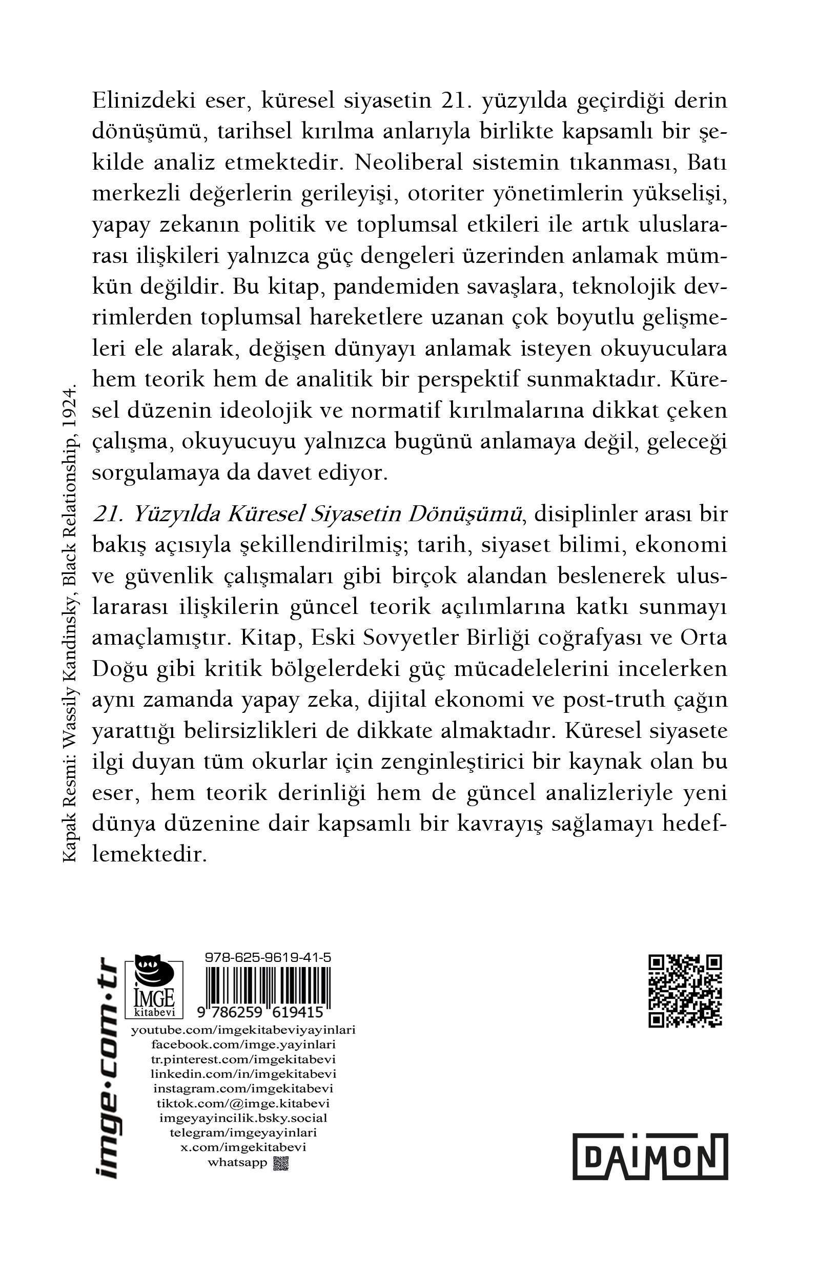 Elinizdeki eser, küresel siyasetin 21. yüzyılda geçirdiği derin dönüşümü, tarihsel kırılma anlarıyla birlikte kapsamlı bir şekilde analiz etmektedir. Neoliberal sistemin tıkanması, Batı merkezli değerlerin gerileyişi, otoriter yönetimlerin yükselişi, yapay zekanın politik ve toplumsal etkileri ile artık uluslararası ilişkileri yalnızca güç dengeleri üzerinden anlamak mümkün değildir. Bu kitap, pandemiden savaşlara, teknolojik devrimlerden toplumsal hareketlere uzanan çok boyutlu gelişmeler ele alarak, değişen dünyayı anlamak isteyen okuyuculara hem teorik hem de analitik bir perspektif sunmaktadır. Küresel düzenin ideolojik ve normatif kırılmalarına dikkat çeken çalışma, okuyucuyu yalnızca bugünü anlamaya değil, geleceği sorgulamaya da davet ediyor.