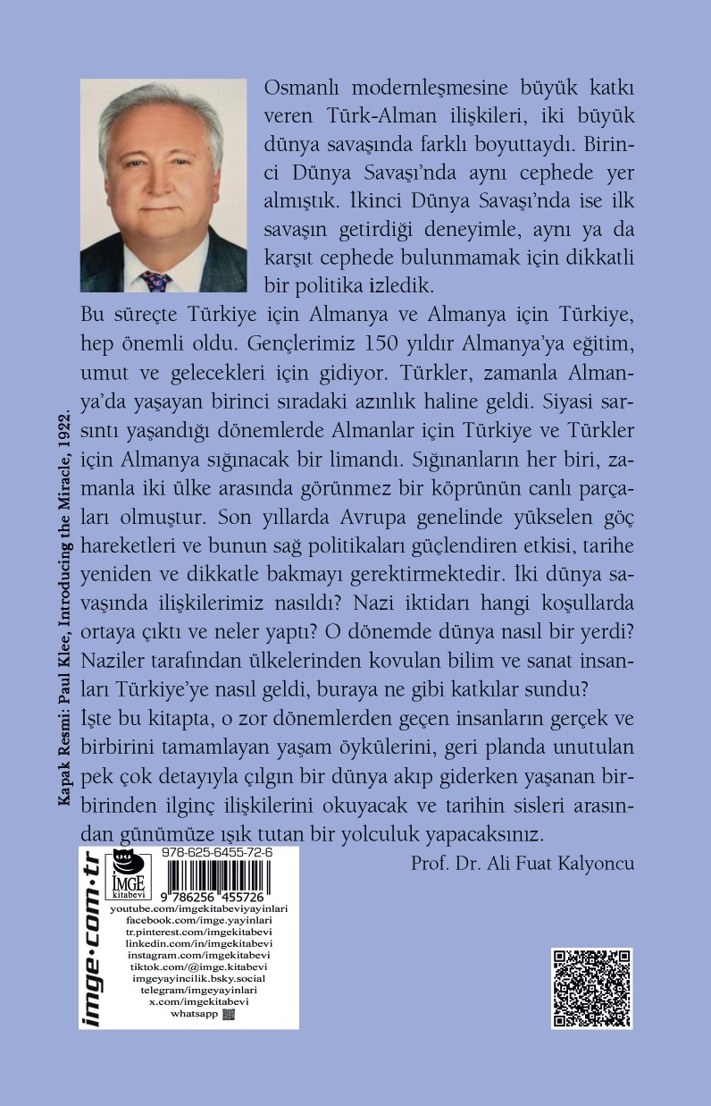 Özellikler: Boyut: 13,5 x 21 / İthal Kitap Kâğıdı / 476 sayfa / 2. Baskı Şubat 2026 1. Baskı, Aralık 2025 Osmanlı modernleşmesine büyük katkı veren Türk-Alman ilişkileri, iki büyük dünya savaşında farklı boyuttaydı. Birinci Dünya Savaşı’nda aynı cephede yer almıştık. İkinci Dünya Savaşı’nda ise ilk savaşın getirdiği deneyimle, aynı ya da karşıt cephede bulunmamak için dikkatli bir politika izledik. Bu süreçte Türkiye için Almanya ve Almanya için Türkiye, hep önemli oldu. Gençlerimiz 150 yıldır Almanya’ya eğitim, umut ve gelecekleri için gidiyor. Türkler, zamanla Almanya’da yaşayan birinci sıradaki azınlık haline geldi. Siyasi sarsıntı yaşandığı dönemlerde Almanlar için Türkiye ve Türkler için Almanya sığınacak bir limandı. Sığınanların her biri, zamanla iki ülke arasında görünmez bir köprünün canlı parçaları olmuştur. Son yıllarda Avrupa genelinde yükselen göç hareketleri ve bunun sağ politikaları güçlendiren etkisi, tarihe yeniden ve dikkatle bakmayı gerektirmektedir. İki dünya savaşında ilişkilerimiz nasıldı? Nazi iktidarı hangi koşullarda ortaya çıktı ve neler yaptı? O dönemde dünya nasıl bir yerdi? Naziler tarafından ülkelerinden kovulan bilim ve sanat insanları Türkiye’ye nasıl geldi, buraya ne gibi katkılar sundu? İşte bu kitapta, o zor dönemlerden geçen insanların gerçek ve birbirini tamamlayan yaşam öykülerini, geri planda unutulan pek çok detayıyla çılgın bir dünya akıp giderken yaşanan birbirinden ilginç ilişkilerini okuyacak ve tarihin sisleri arasından günümüze ışık tutan bir yolculuk yapacaksınız. Prof. Dr. Ali Fuat Kalyoncu