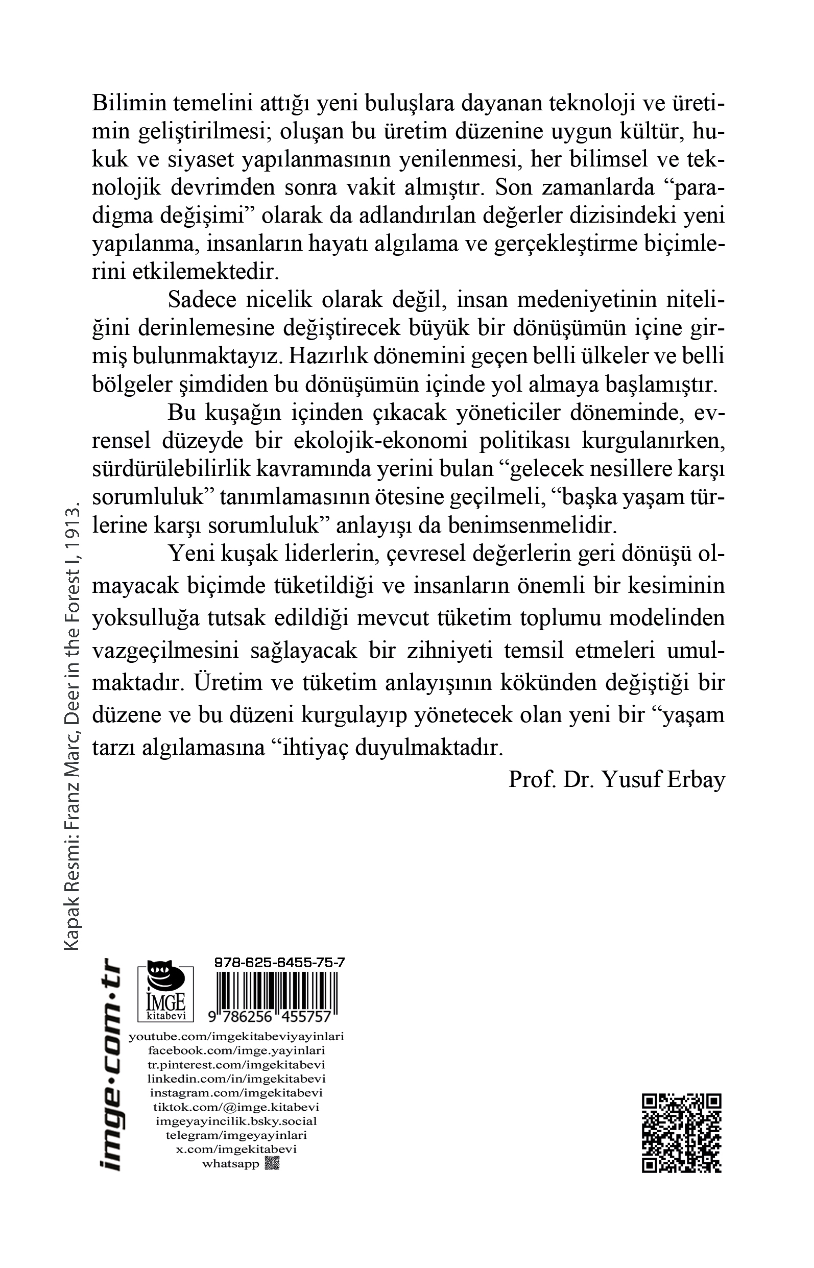 Özellikler: Boyut: 13,5 x 21 / İthal Kitap Kâğıdı / 134 sayfa / 1. Baskı, Mart 2026 Bilimin temelini attığı yeni buluşlara dayanan teknoloji ve üretimin geliştirilmesi; oluşan bu üretim düzenine uygun kültür, hukuk ve siyaset yapılanmasının yenilenmesi, her bilimsel ve teknolojik devrimden sonra vakit almıştır. Son zamanlarda “paradigma değişimi” olarak da adlandırılan değerler dizisindeki yeni yapılanma, insanların hayatı algılama ve gerçekleştirme biçimlerini etkilemektedir. Sadece nicelik olarak değil, insan medeniyetinin niteliğini derinlemesine değiştirecek büyük bir dönüşümün içine girmiş bulunmaktayız. Hazırlık dönemini geçen belli ülkeler ve belli bölgeler şimdiden bu dönüşümün içinde yol almaya başlamıştır. Bu kuşağın içinden çıkacak yöneticiler döneminde, evrensel düzeyde bir ekolojik-ekonomi politikası kurgulanırken, sürdürülebilirlik kavramında yerini bulan “gelecek nesillere karşı sorumluluk” tanımlamasının ötesine geçilmeli, “başka yaşam türlerine karşı sorumluluk” anlayışı da benimsenmelidir. Yeni kuşak liderlerin, çevresel değerlerin geri dönüşü olmayacak biçimde tüketildiği ve insanların önemli bir kesiminin yoksulluğa tutsak edildiği mevcut tüketim toplumu modelinden vazgeçilmesini sağlayacak bir zihniyeti temsil etmeleri umul-maktadır. Üretim ve tüketim anlayışının kökünden değiştiği bir düzene ve bu düzeni kurgulayıp yönetecek olan yeni bir “yaşam tarzı algılamasına “ihtiyaç duyulmaktadır. Prof. Dr. Yusuf Erbay
